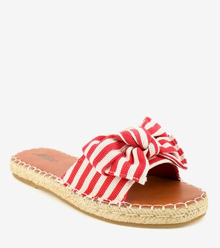 Łączą ze sobą one biało-czerwone paski i plecioną płaską podeszwę. Elementem dekoracyjnym jest jedynie stylowa kokarda na froncie, która perfekcyjnie będzie fitować z luźnymi kwiecistymi sukienkami.