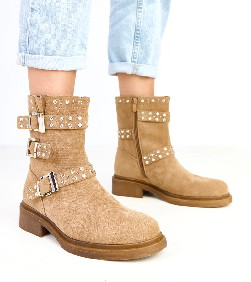 Brązowe botki z cyrkoniami na niskim obcasie Brosca