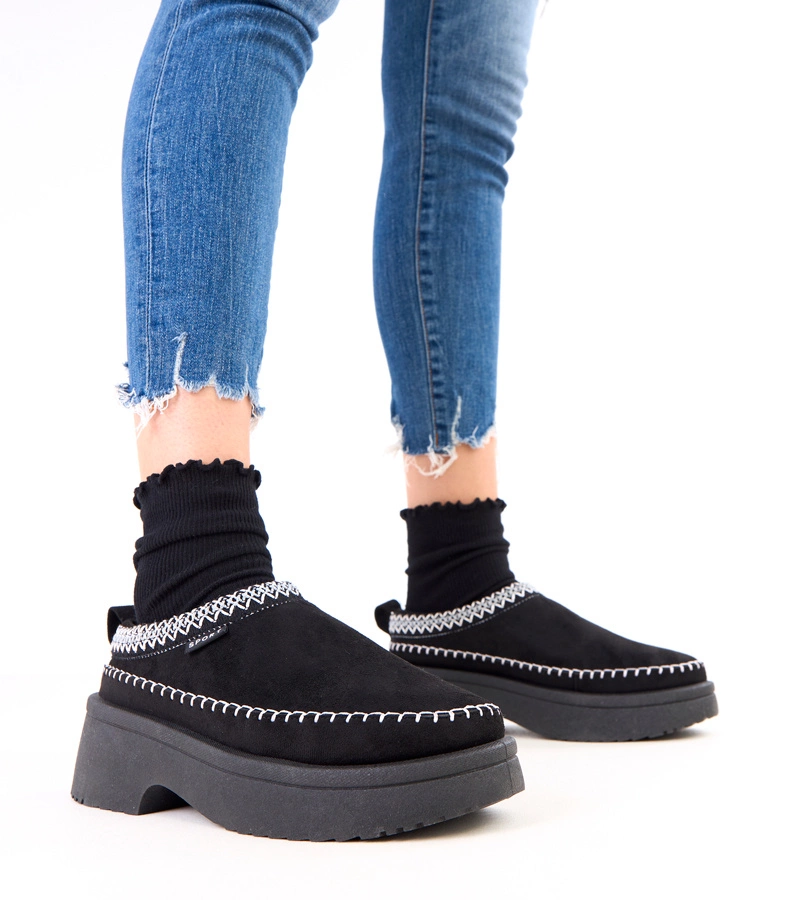 Czarne kapcie zdobione haftem na platformie Julen