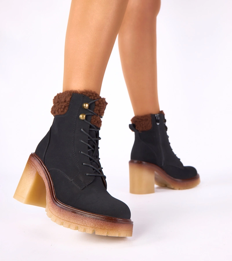 Czarne botki na słupku z futerkiem na cholewce Alona