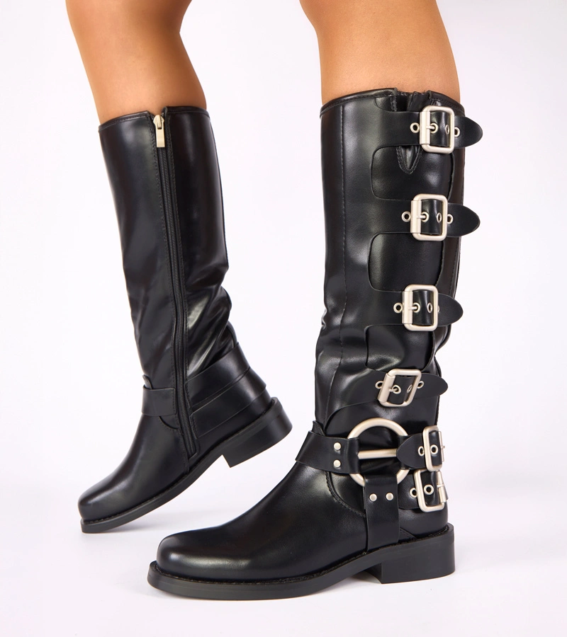 ( ilość produktów: 9 )Czarne kozaki na płaskim obcasie zdobione klamrami przed kolano Taliba