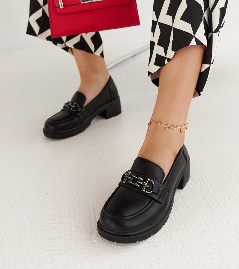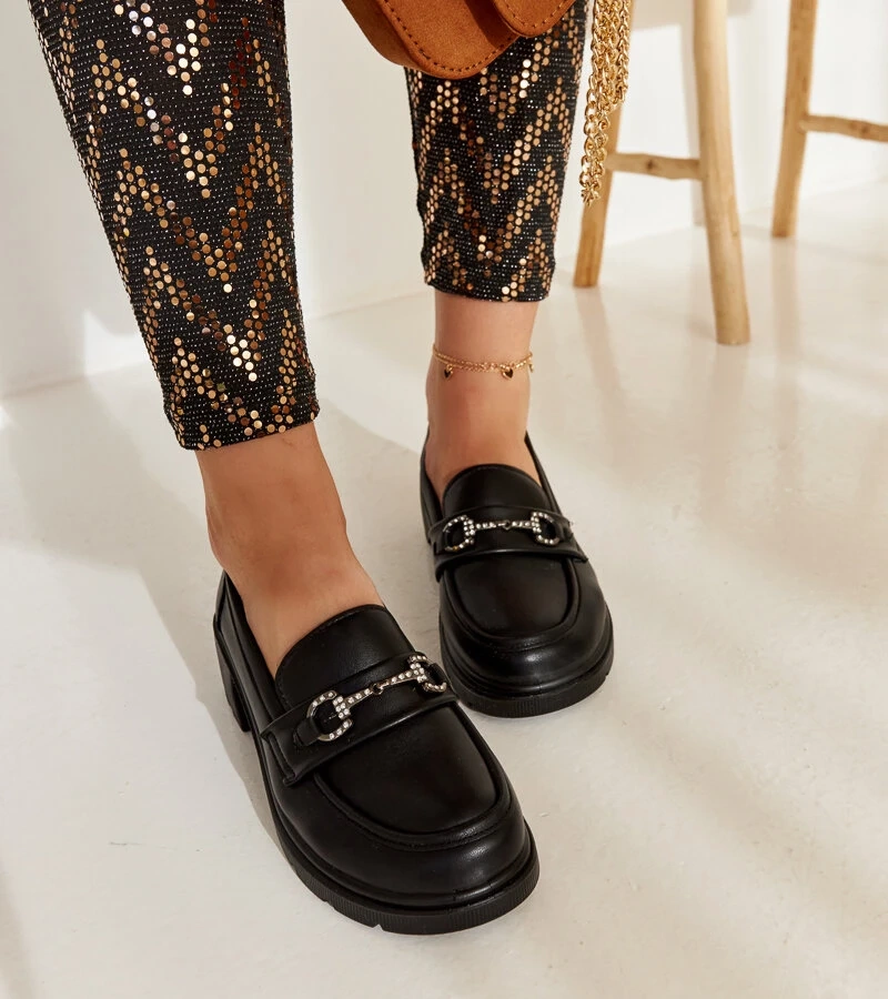 Czarne mokasyny z ekoskóry na obcasie z metalową ozdobą Lyyli