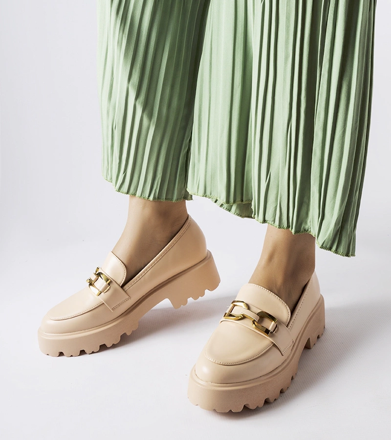 Beżowe lakierowane mokasyny na koturnie Erin