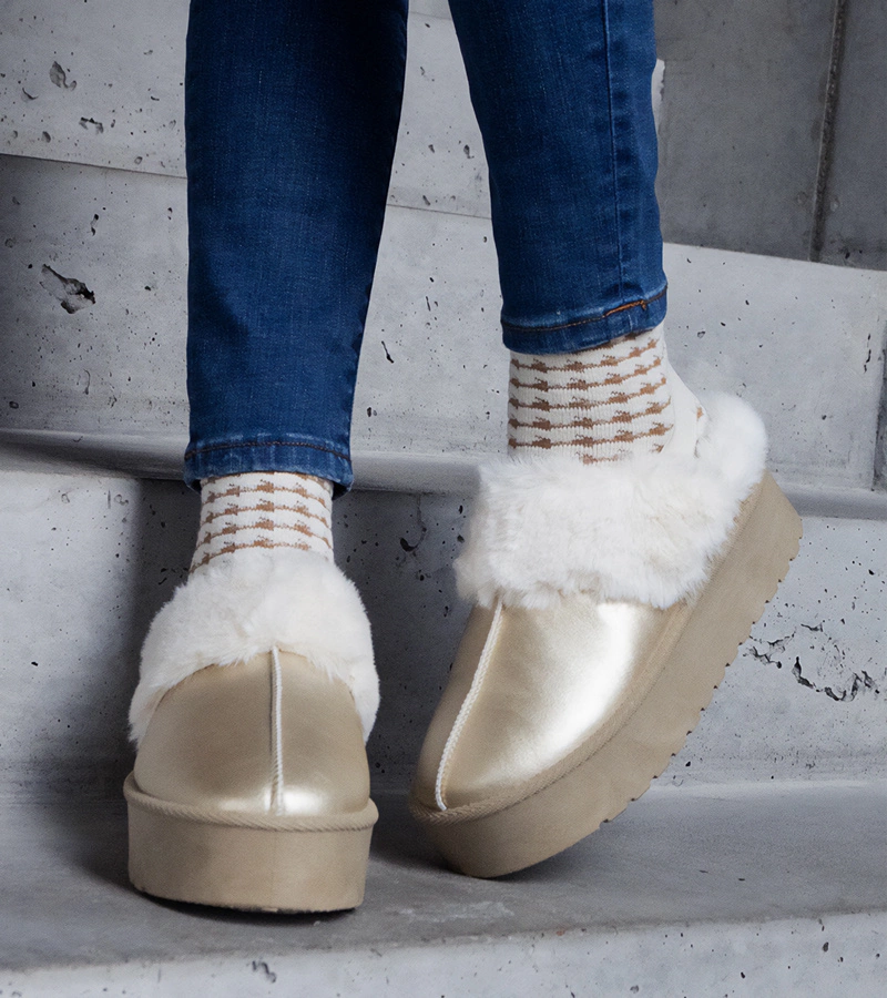 Złote kapcie na platformie ozdobione futerkiem Asza