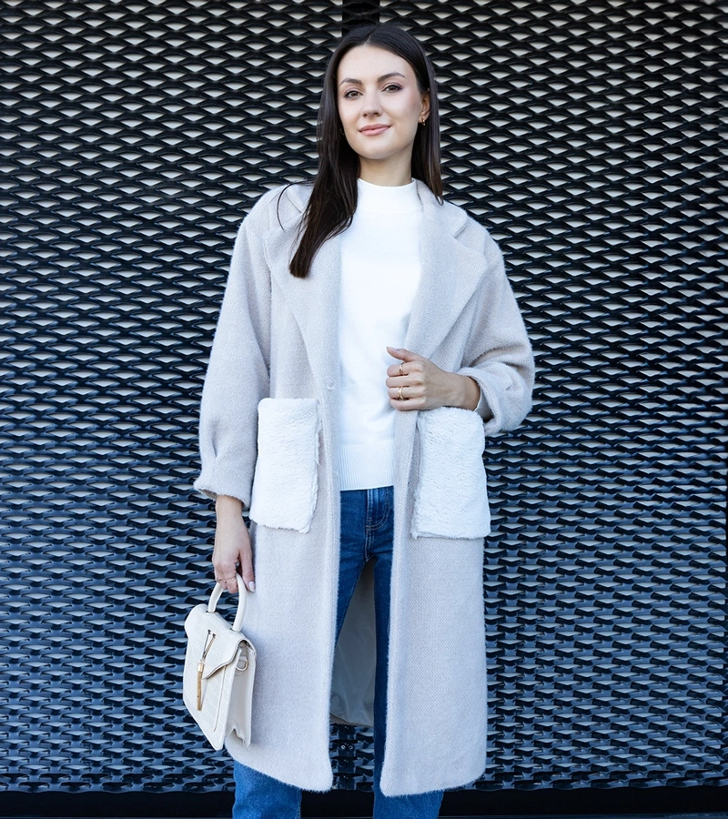 Długi beżowy płaszcz z pluszowymi kieszonkami Badra
