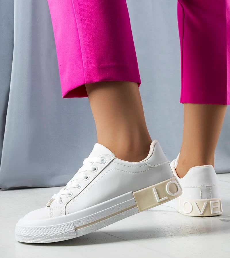Biało-beżowe tenisówki zdobione napisem Nora