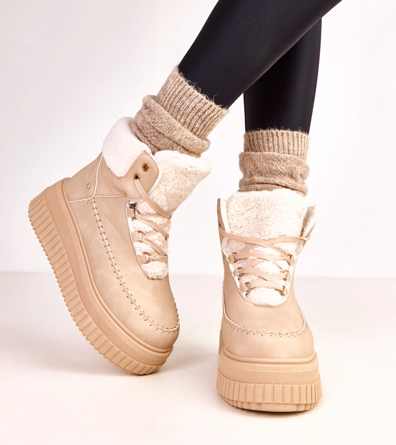 Beżowe botki z ekozamszową cholewką i futerkiem Satisa