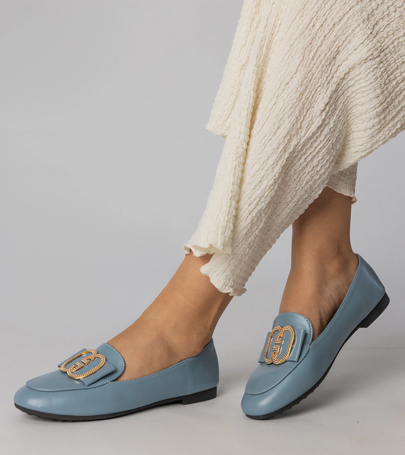 Niebieskie mokasyny damskie ze złotą ozdobą Frada